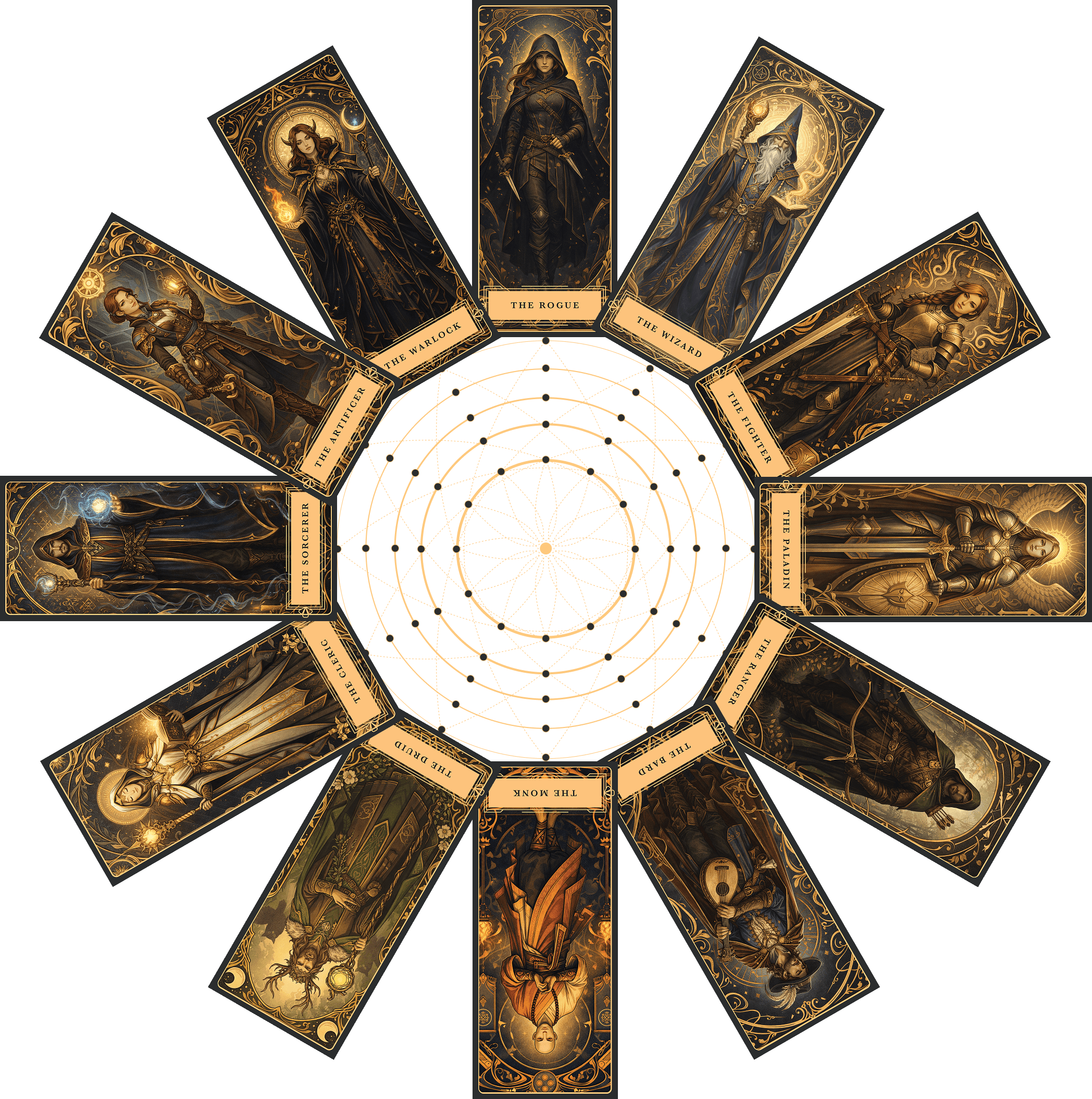 24 diferentes tarjetas de clase en formato tarot. Arte original exclusivo, scorecard con tu radar de habilidades en el reverso. El recordatorio físico de quién eres como diseñador — y hacia dónde vas.